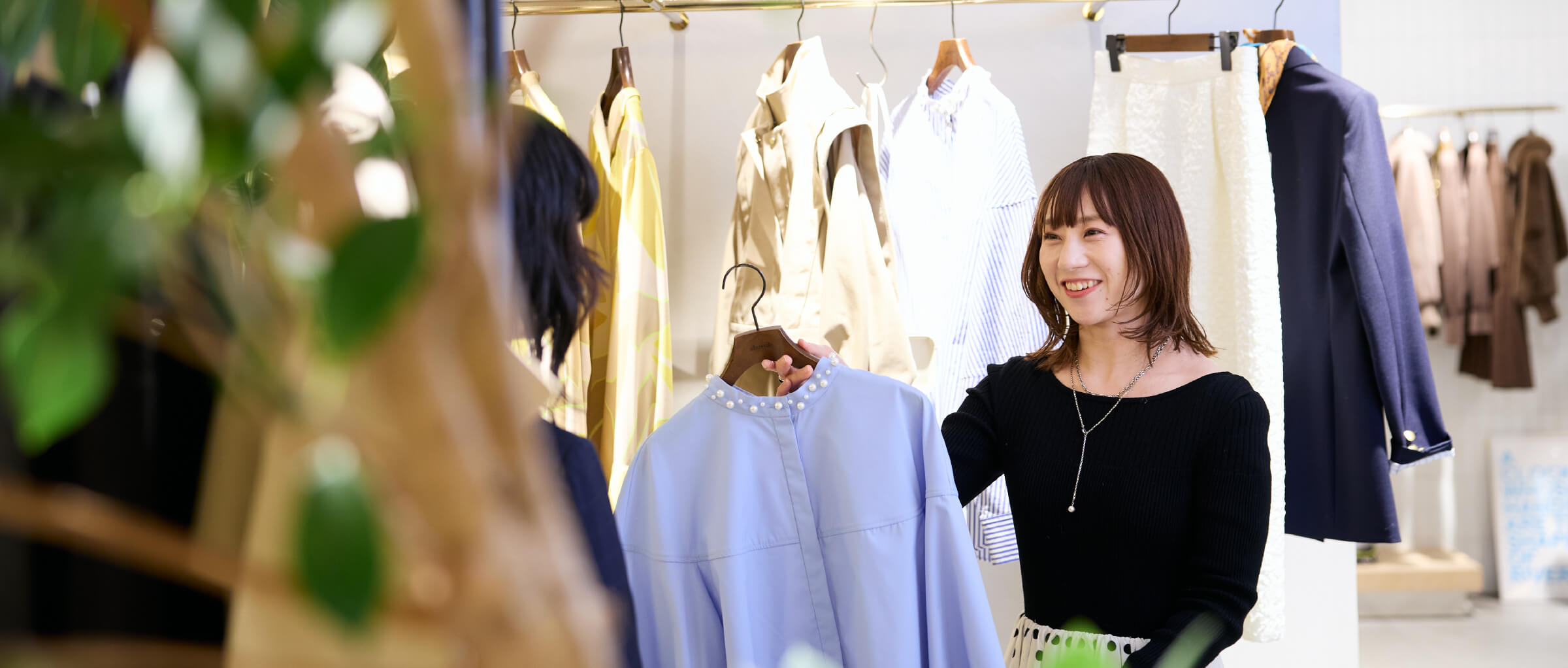 まず大切にしているのは、地域性です。同じブランドでも、街が変わればお客さまの空気はまったく違います。私が勤務する店舗はカジュアルなスタイルを好む方が多く、都心にある店舗のお客さまに響くような華やかな見せ方をそのまま持ち込んでも、うまくいかないことがあります。その街のお客さまの好みを読み解き、適したコーディネートを組んでいくことが大前提です。ただ、商品や見せ方がどんなによくても、売上が伸び悩むこともあります。最後に効いてくるのは、やはりチームワーク。作業の正確さを具体的に評価されることで自信につながる人もいれば、「助かるよ」という一言で力を発揮できる人もいます。相手に合わせて伝え方を変え、成果が出たときはその場ですぐ言葉にする。いい接客は、実は仲間の気持ちに目を向けることから始まるのだと思っています。